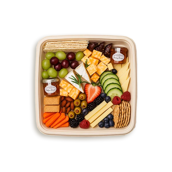 Seasonal fruit and veggies accompanied by brie, havarti, gouda, spicy jack, smoked gouda, colby jack, almonds, olives, dark chocolate with almonds, jam, and honey